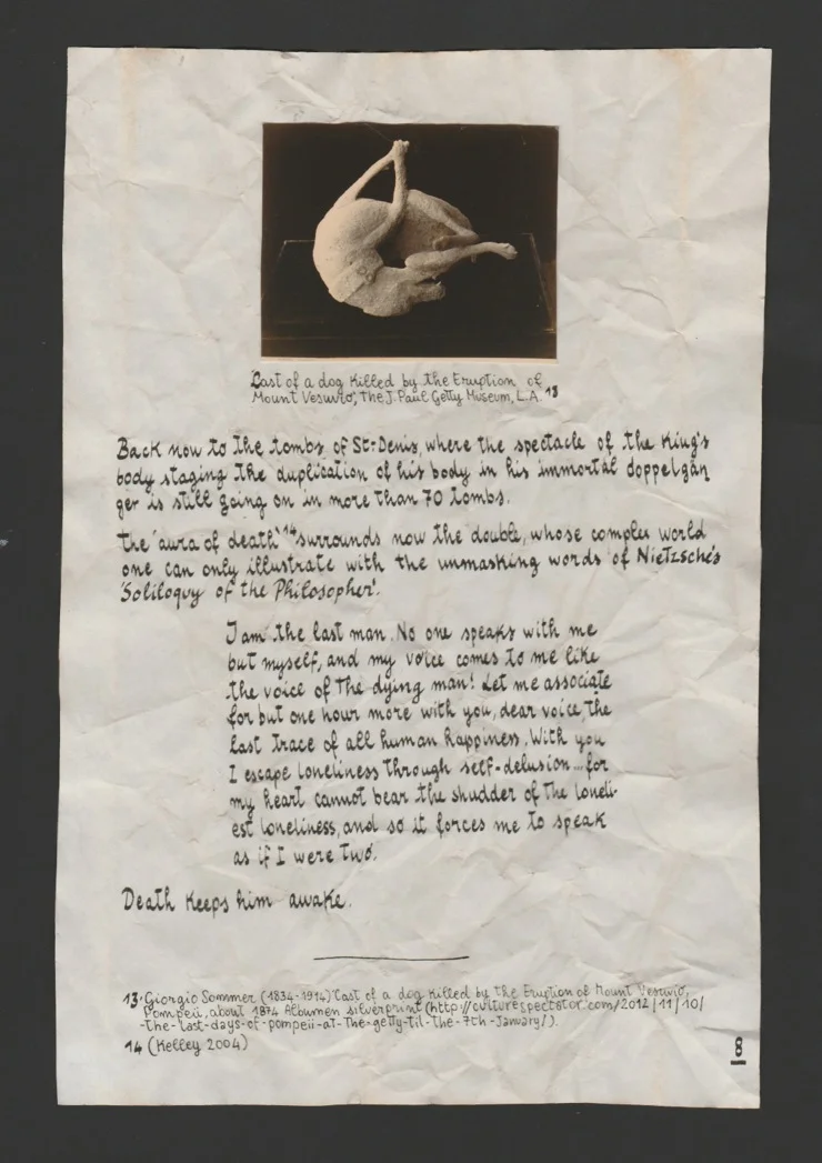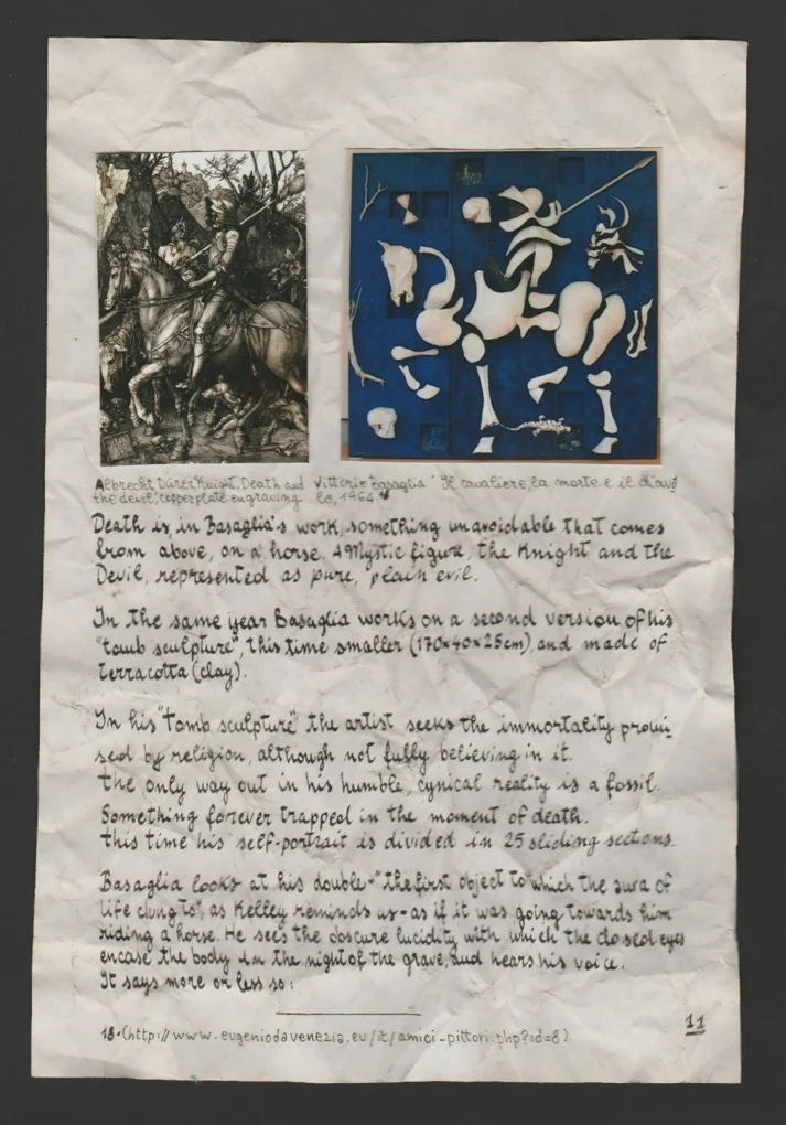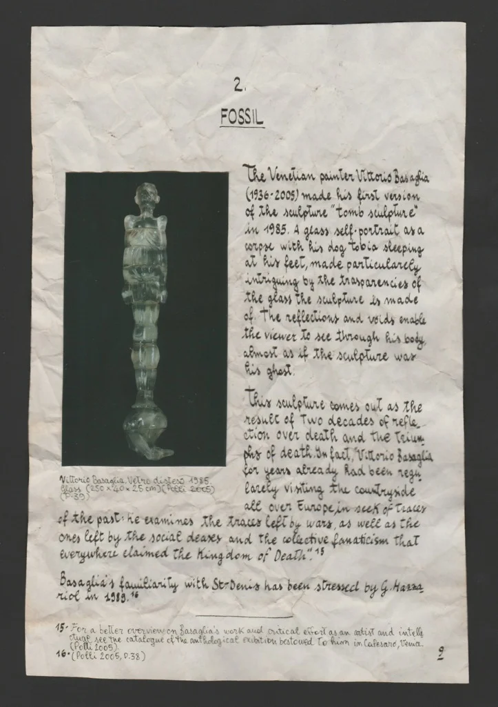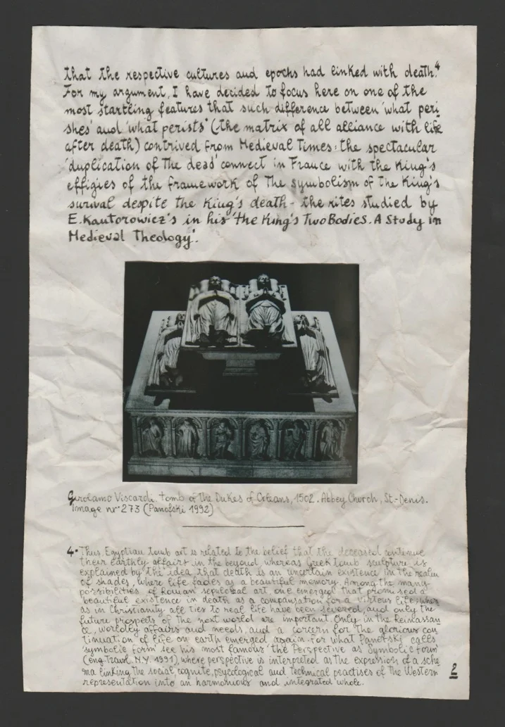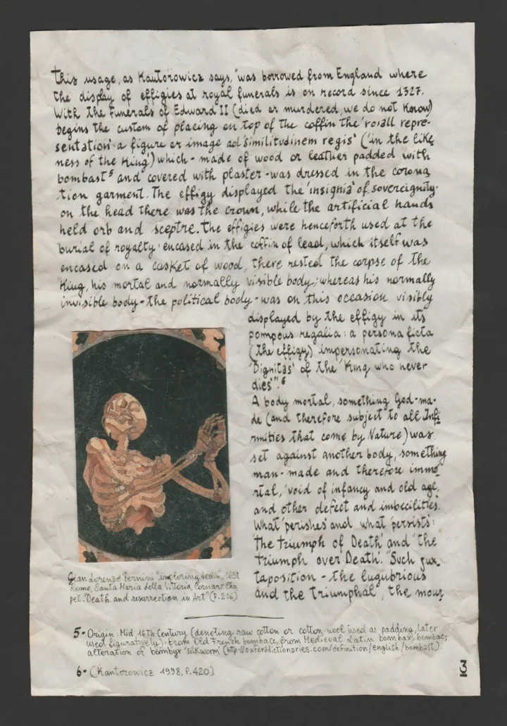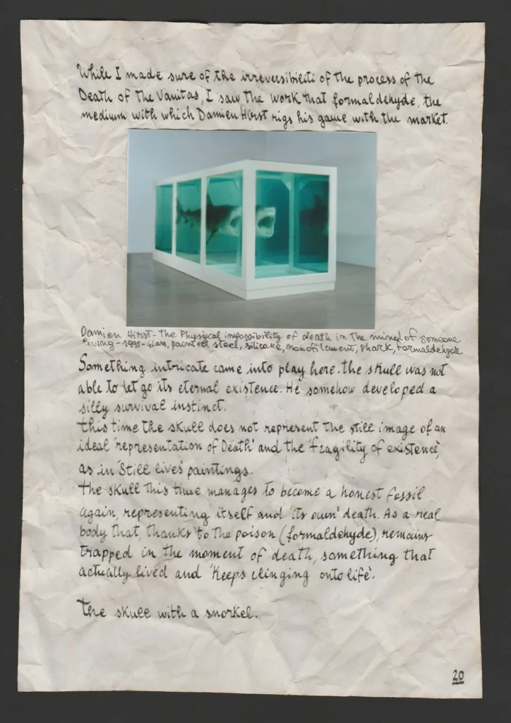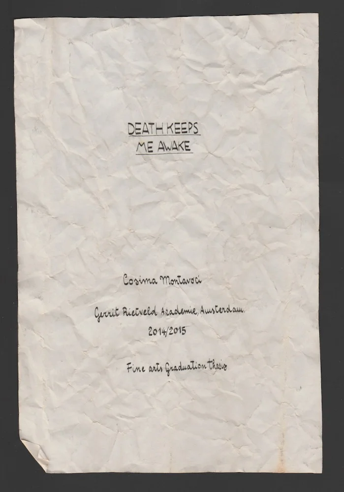 "[...] Cosima's thesis is a startingly gothic presentation, hand-written on used paper and presented in a thickly hand-painted black box. Her text considers the image of death in the art practices of a number of contemporary artists, with emphasis on the work of the Italian artist Vittorio Basaglia, and relates these to a selection of images of death from European art history. This evolves into a consideration of the relationship between the mortal body and the body of the work of art, the in-between role of fossilization, and its relationship to the traditional Vanitas.