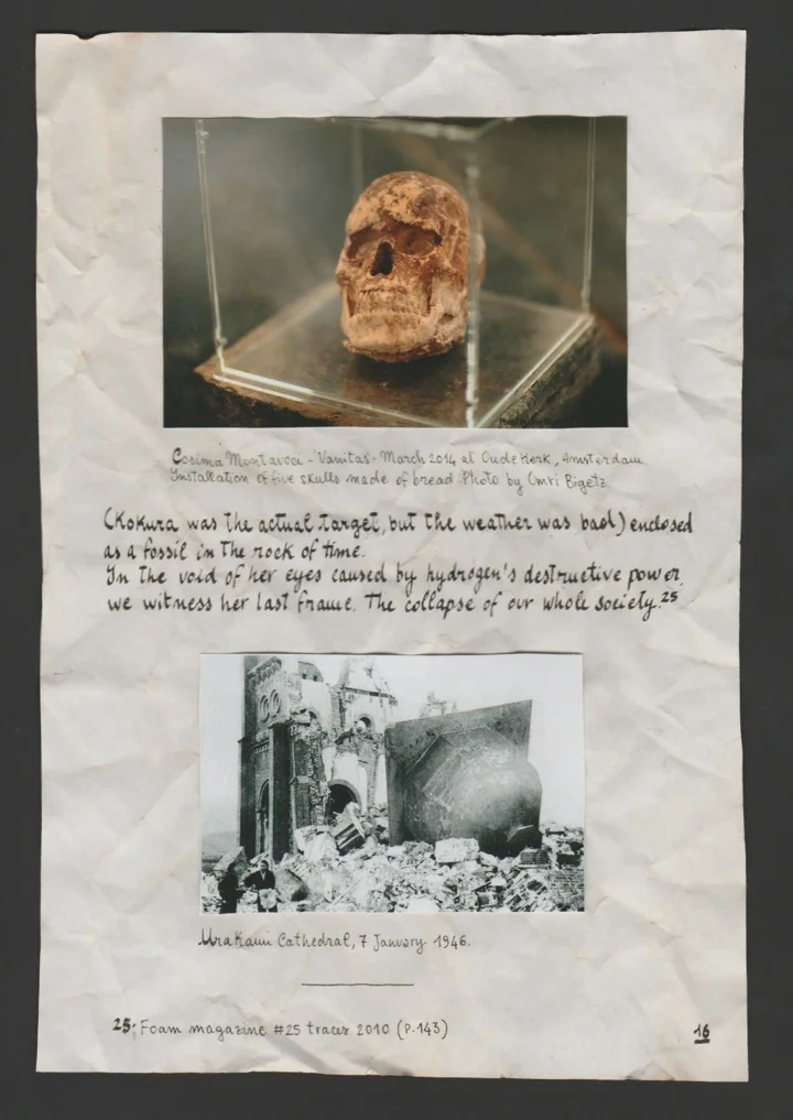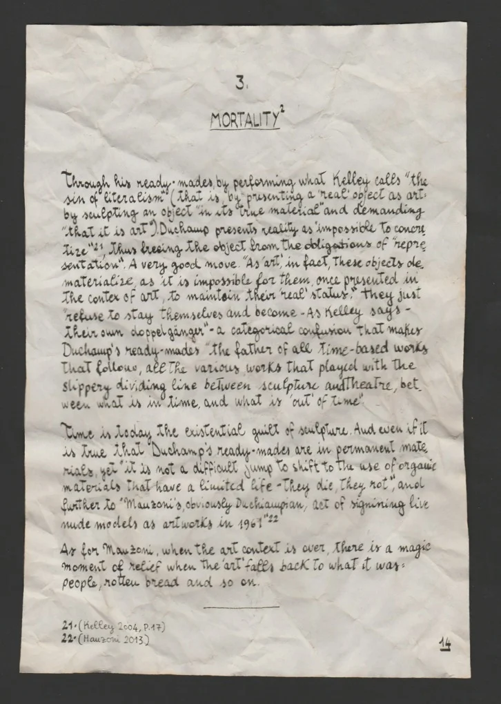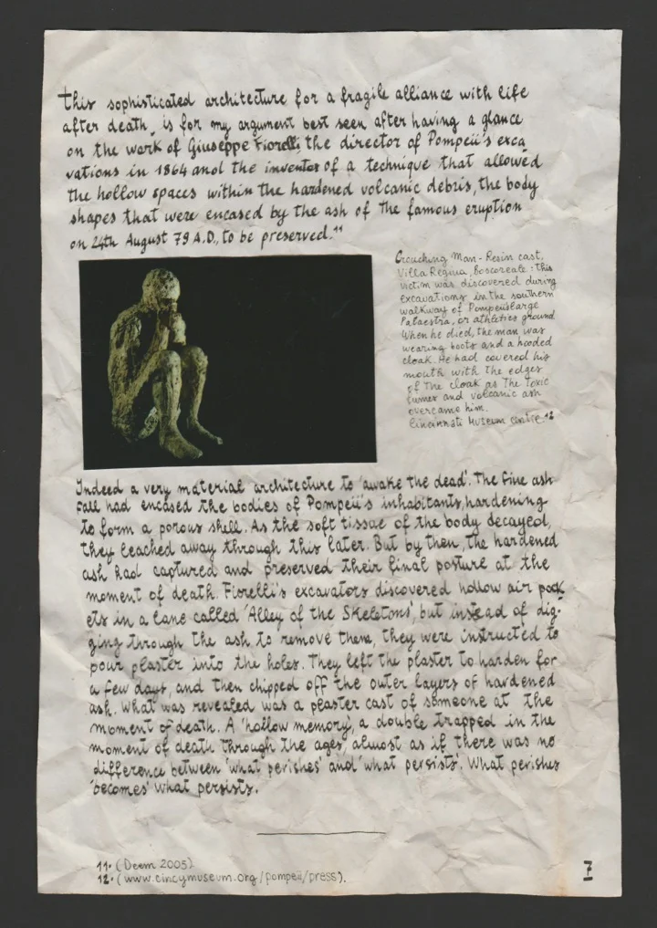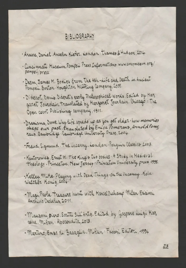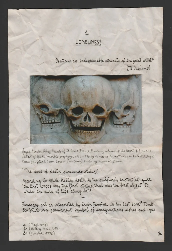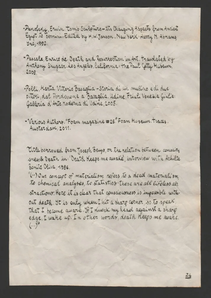 "[...] Cosima's thesis is a startingly gothic presentation, hand-written on used paper and presented in a thickly hand-painted black box. Her text considers the image of death in the art practices of a number of contemporary artists, with emphasis on the work of the Italian artist Vittorio Basaglia, and relates these to a selection of images of death from European art history. This evolves into a consideration of the relationship between the mortal body and the body of the work of art, the in-between role of fossilization, and its relationship to the traditional Vanitas.