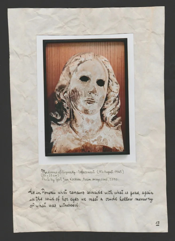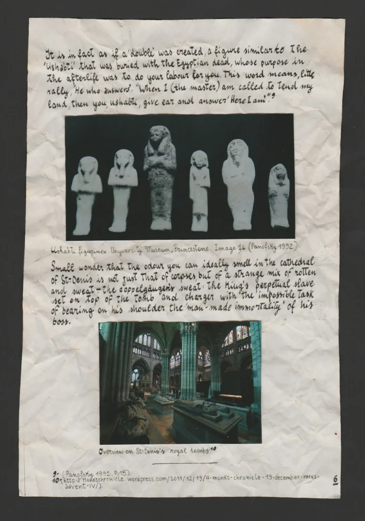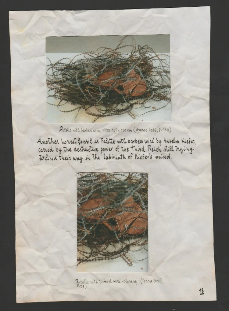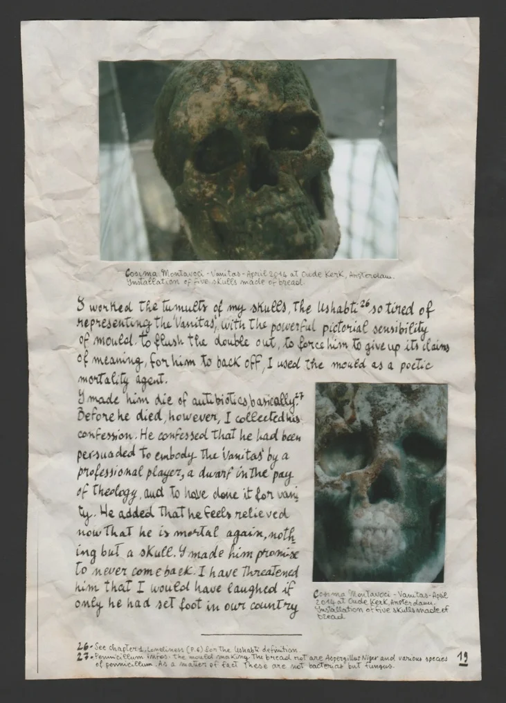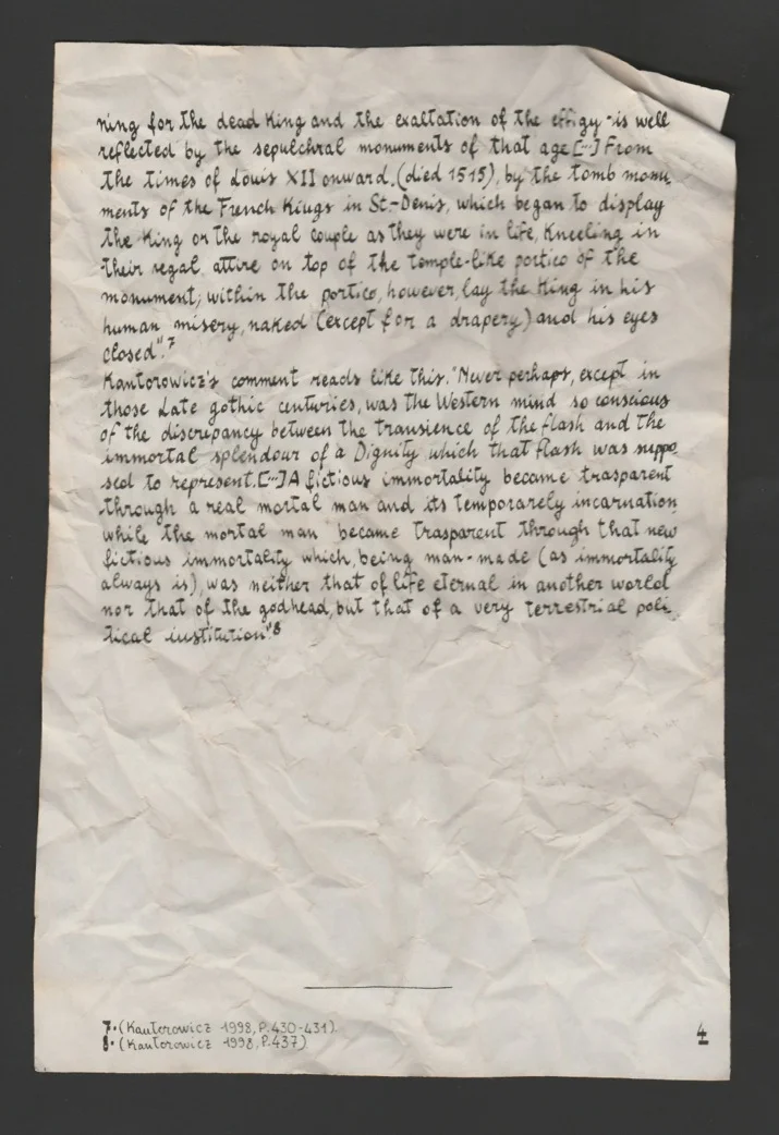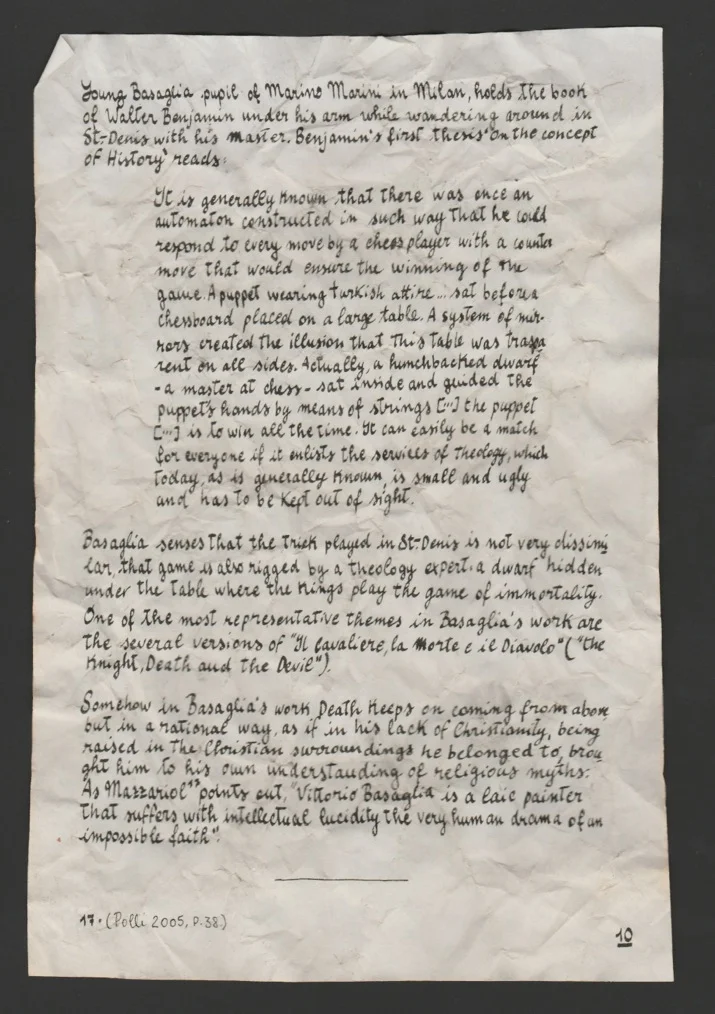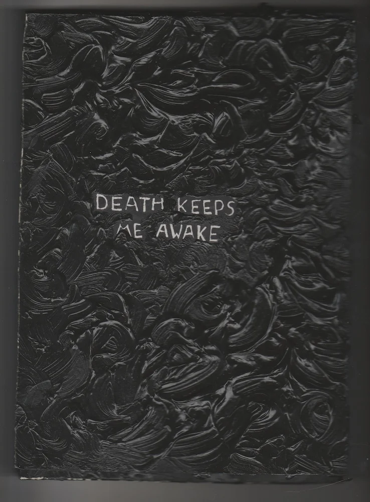 "[...] Cosima's thesis is a startingly gothic presentation, hand-written on used paper and presented in a thickly hand-painted black box. Her text considers the image of death in the art practices of a number of contemporary artists, with emphasis on the work of the Italian artist Vittorio Basaglia, and relates these to a selection of images of death from European art history. This evolves into a consideration of the relationship between the mortal body and the body of the work of art, the in-between role of fossilization, and its relationship to the traditional Vanitas.