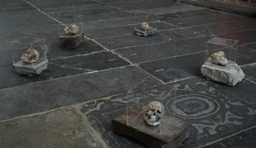The work consists of 5 skulls, each conserved in a plexiglass display case.